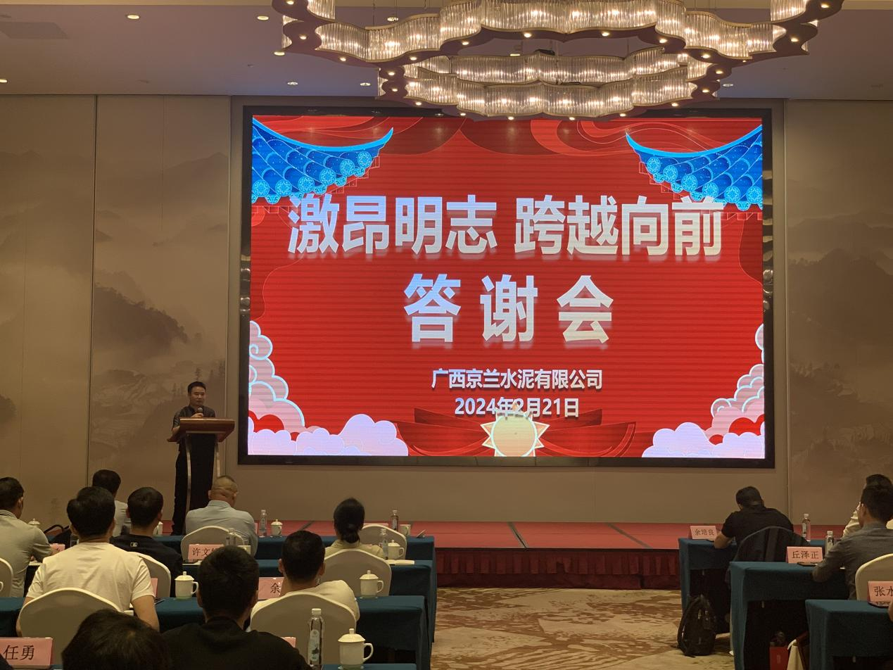 2024年2月21日,廣西京蘭水泥有限公司在柳州蓮花山莊召開以“激昂明志,跨越向前”為主題的2023年度代理商年終總結(jié)大會暨答謝會,共有來自兩廣各地近20個地市、40余位合作代理商參加了本次盛會,會議在熱情洋溢的氛圍中成功舉辦。